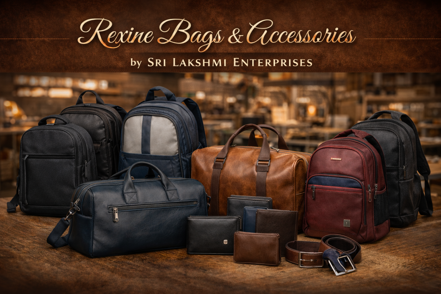 We make a lot of leather and rexine products like laptop bags, school bags, belts, wallets and travel bags. https://srilakshmient.in/