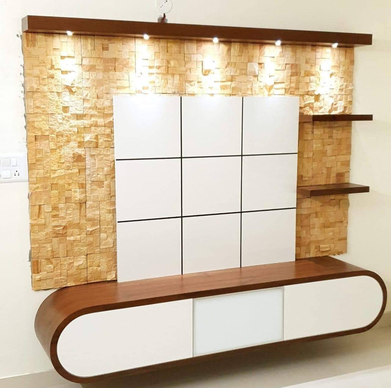 Custom-designed TV units with decorative wall panels and smart storage solutions.